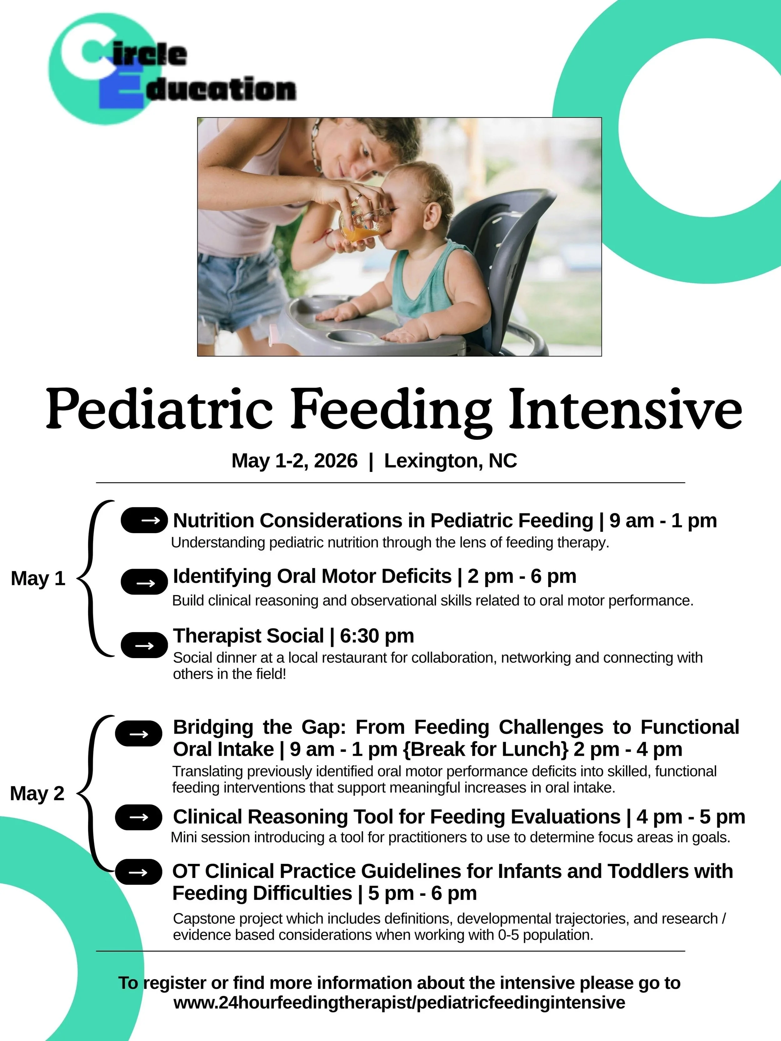 Join Circle Education for a two-day, in-person Pediatric Feeding Intensive designed to help clinicians move from uncertainty to confidence in addressing feeding challenges that impact oral intake.